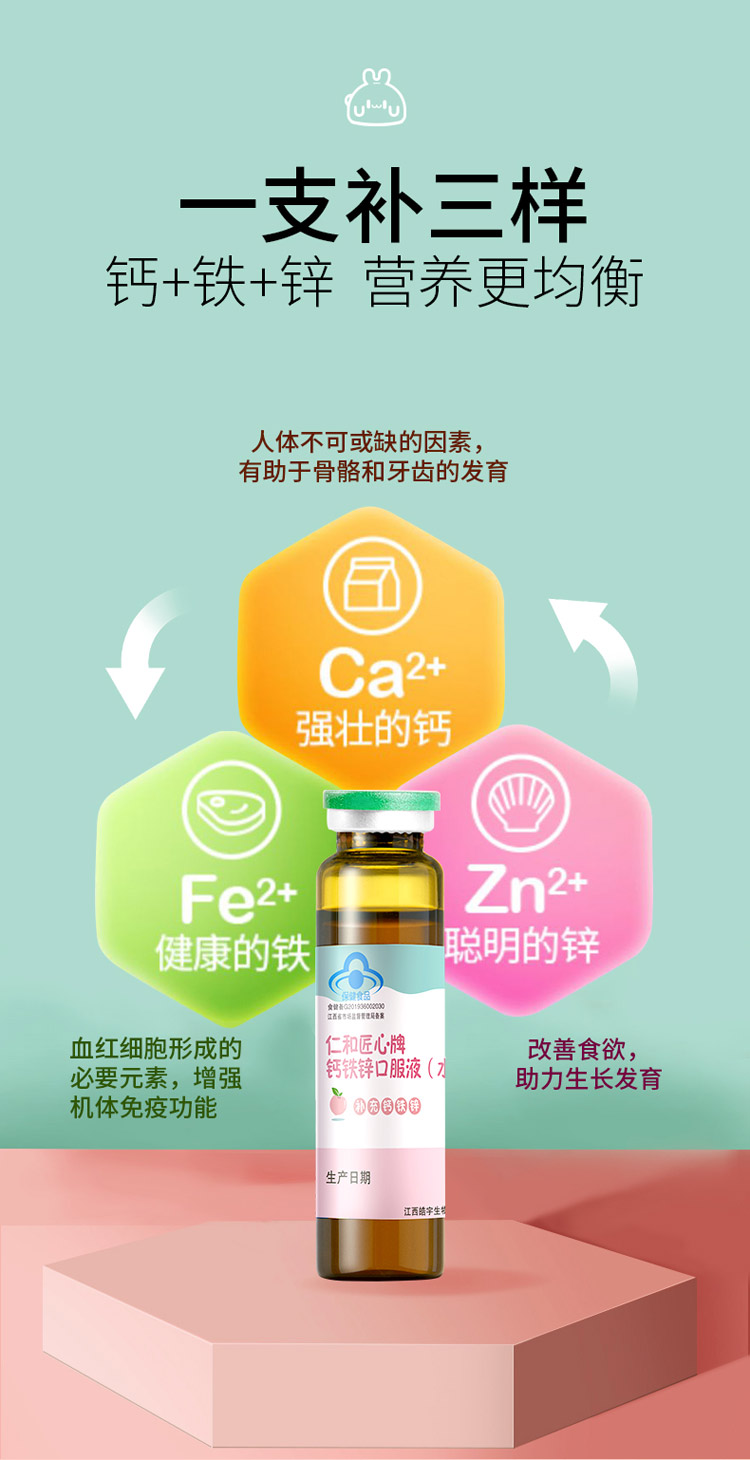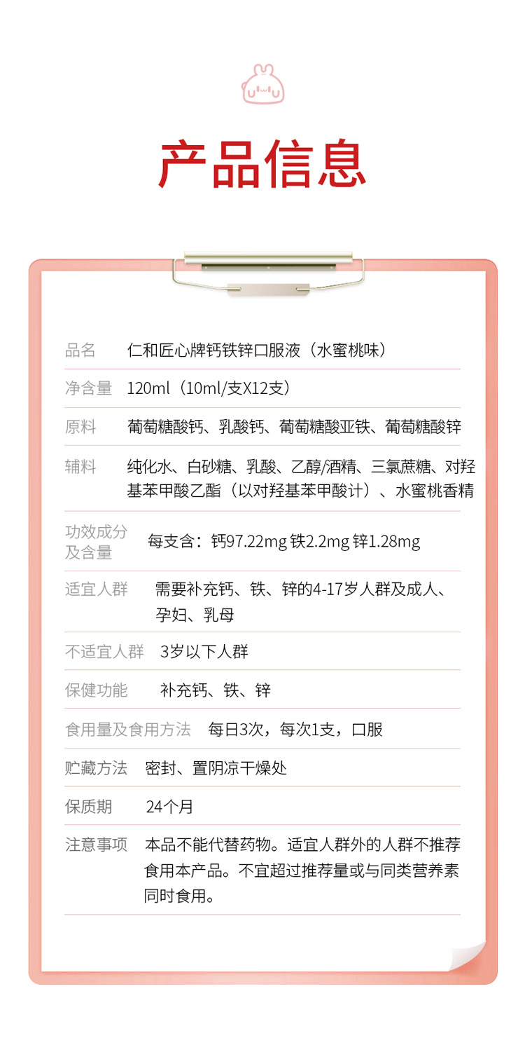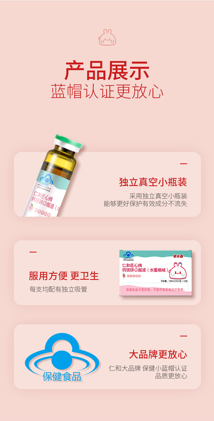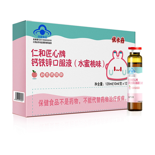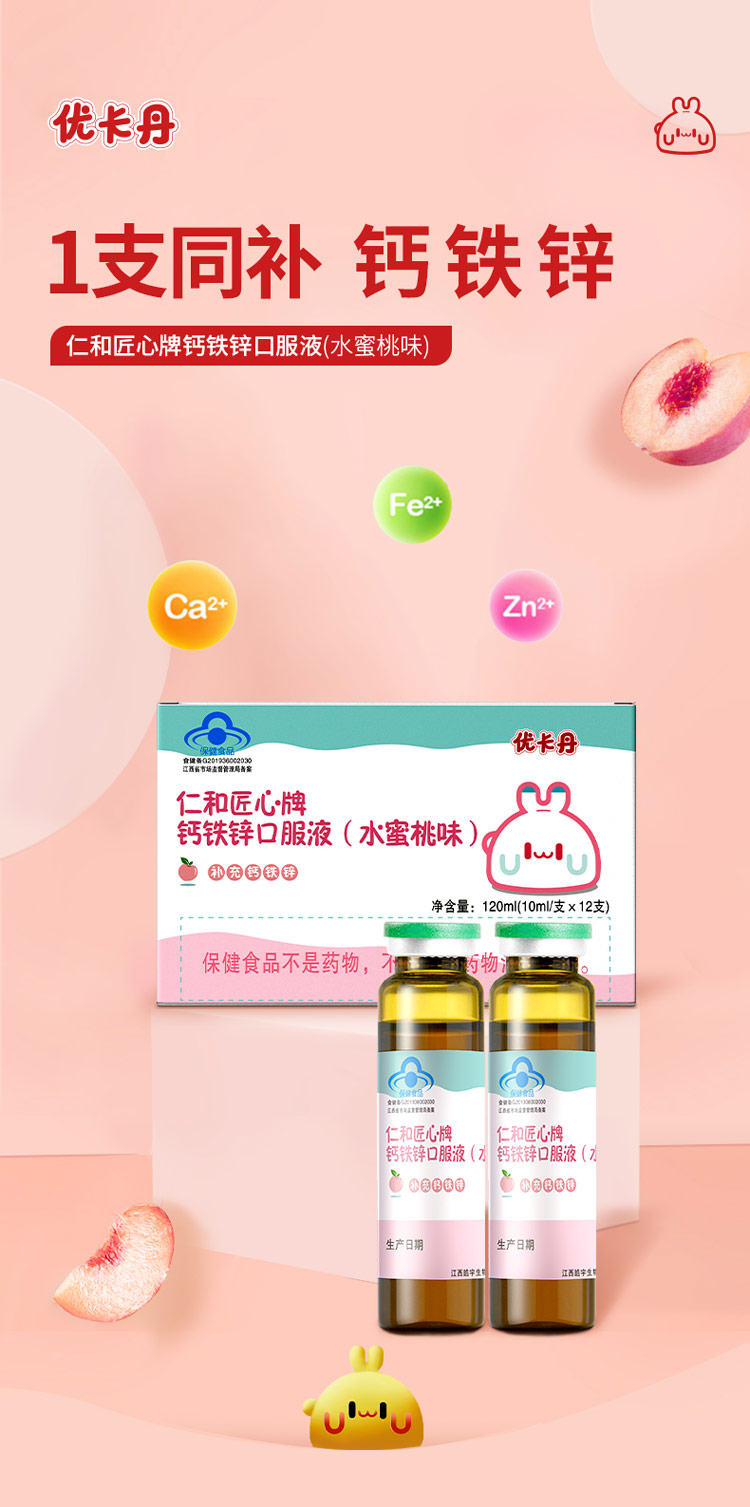 品名:優(yōu)卡丹·仁和匠心牌鈣鐵鋅口服液(水蜜桃味)