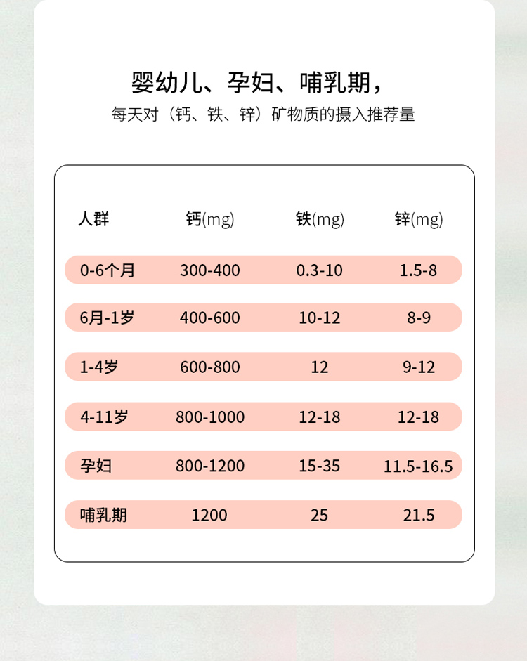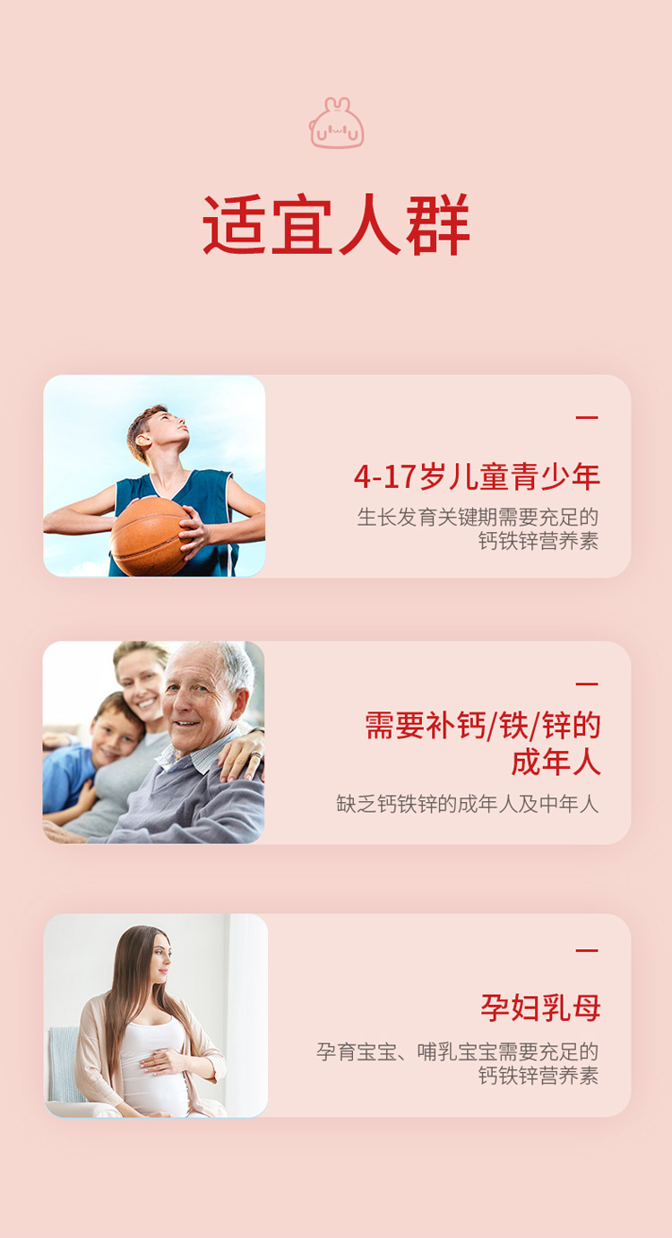 適宜人群:需要補(bǔ)充鈣、鐵、鋅的4-17歲人群及成人,孕婦,乳母