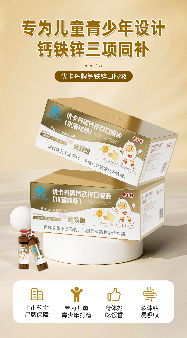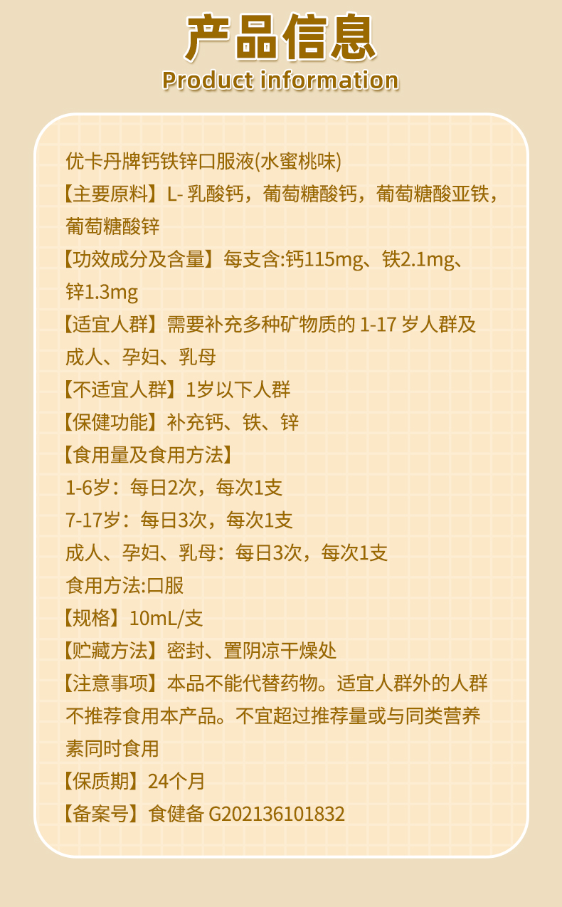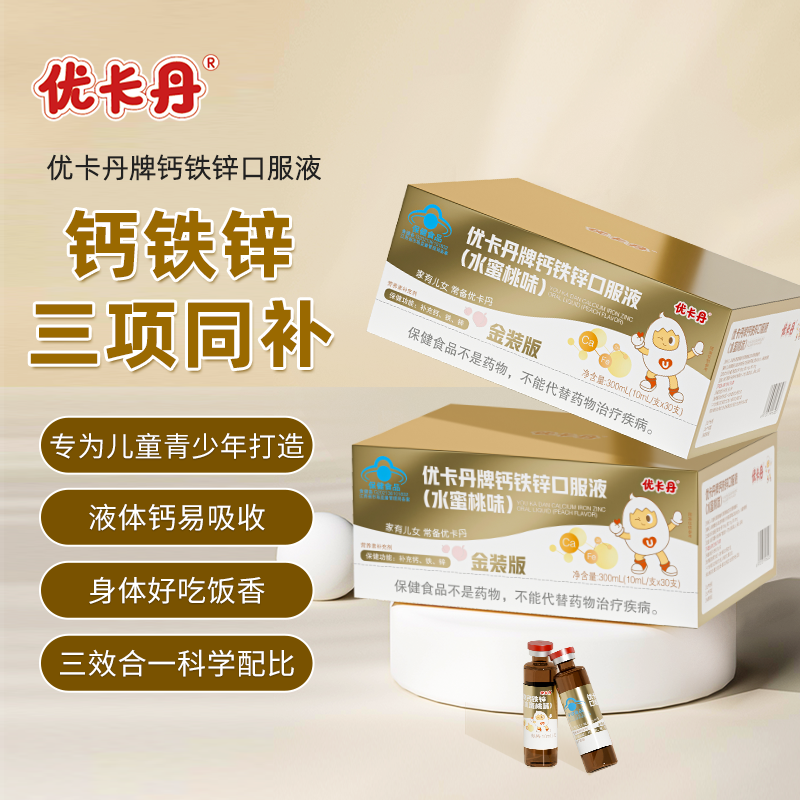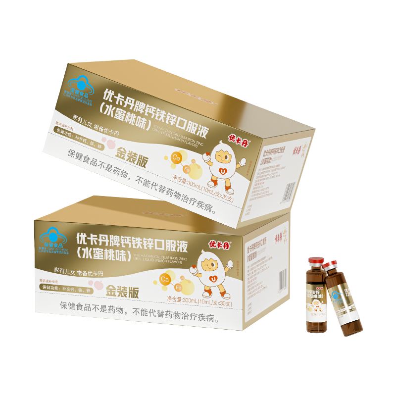 產(chǎn)品名稱:優(yōu)卡丹牌鈣鐵鋅口服液(水蜜桃味)金裝版