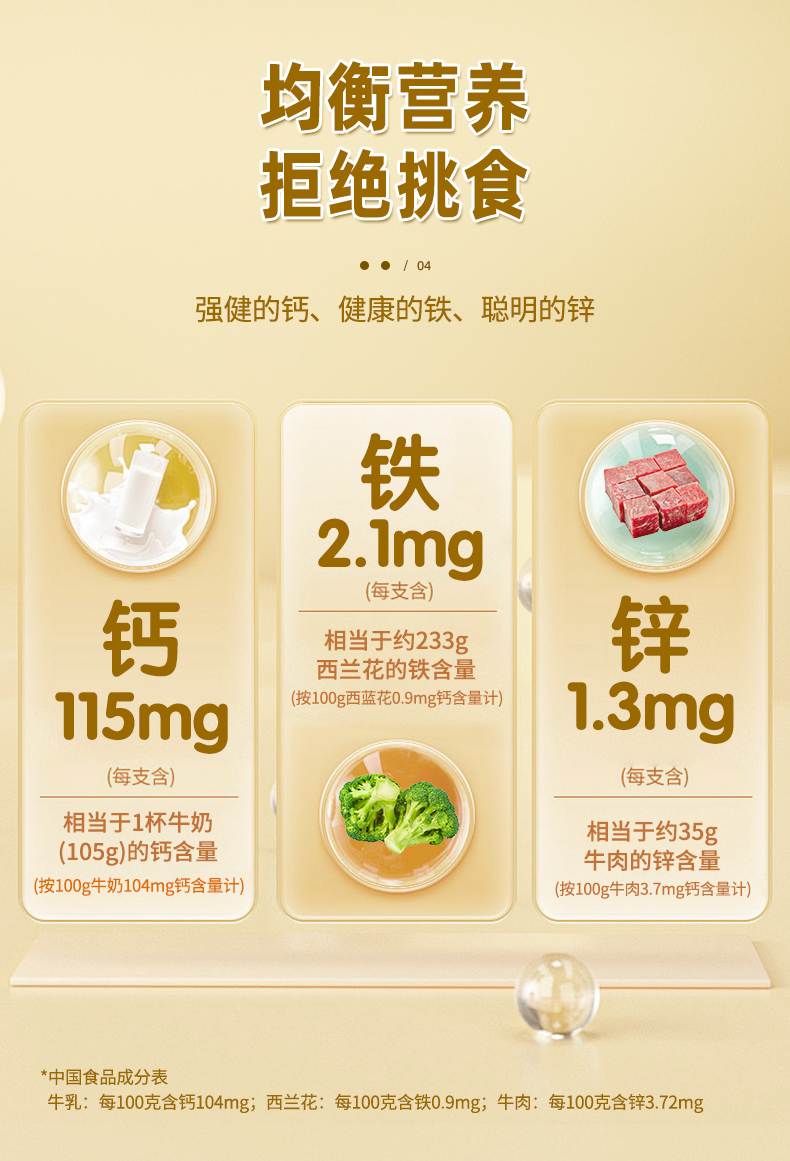 功效成分及含量:每支含:鈣115mg、鐵2.1mg、鋅1.3mg