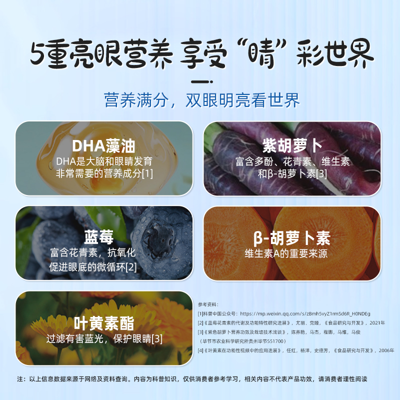 【配料】麥芽糖醇液、山梨糖醇、麥芽糖漿、果膠、卡拉膠、藍莓濃縮汁、DL-蘋果酸、檸檬酸、檸檬酸鈉、DHA藻油、葉黃素酯、滅活型益生菌(乳雙歧桿菌、低聚果糖)、復(fù)配被膜劑(白油、巴西棕櫚蠟)