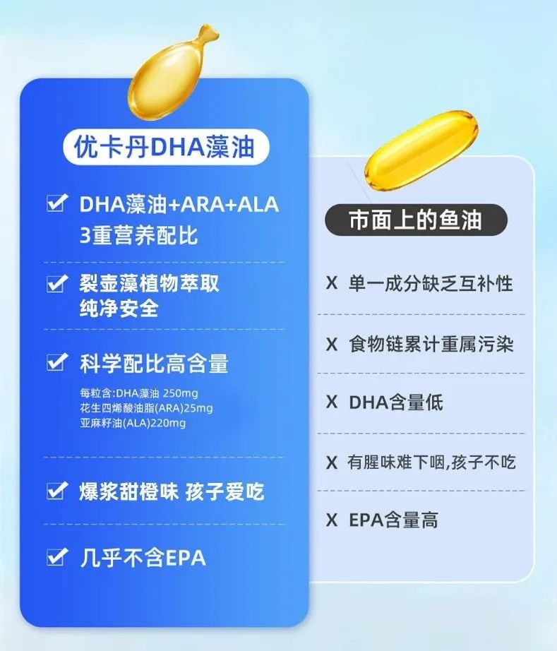 直接對比,輕松為孩子選對DHA。市面上的DHA產(chǎn)品琳瑯滿目,但真正能做到品質(zhì)與效果兼?zhèn)涞膮s寥寥無幾。相比之下,優(yōu)卡丹DHA藻油+ARA凝膠糖果以其3重營養(yǎng)配比,裂壺藻植物萃取純凈安全,3大專利科學(xué)配比,高含量以及無腥味等優(yōu)勢脫穎而出,成為眾多家庭的優(yōu)先之選。