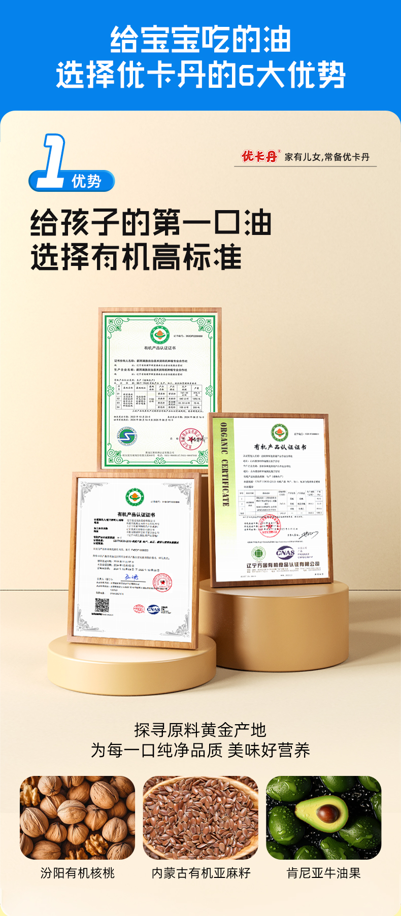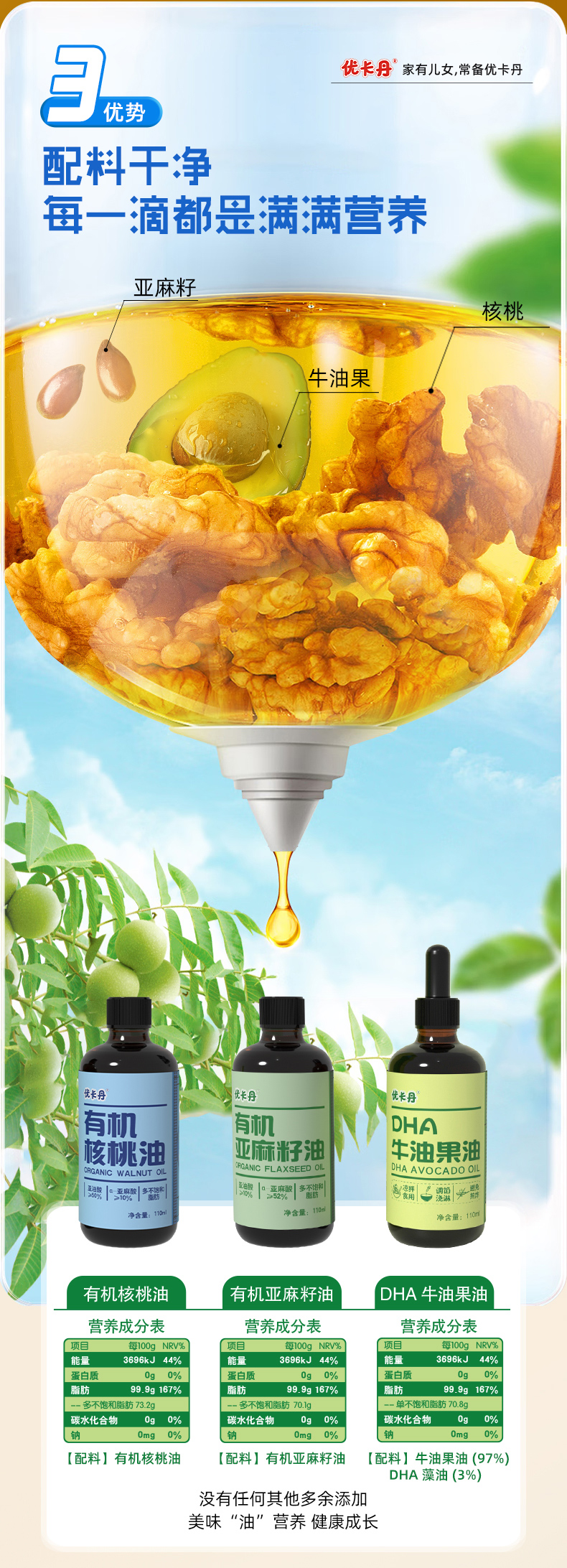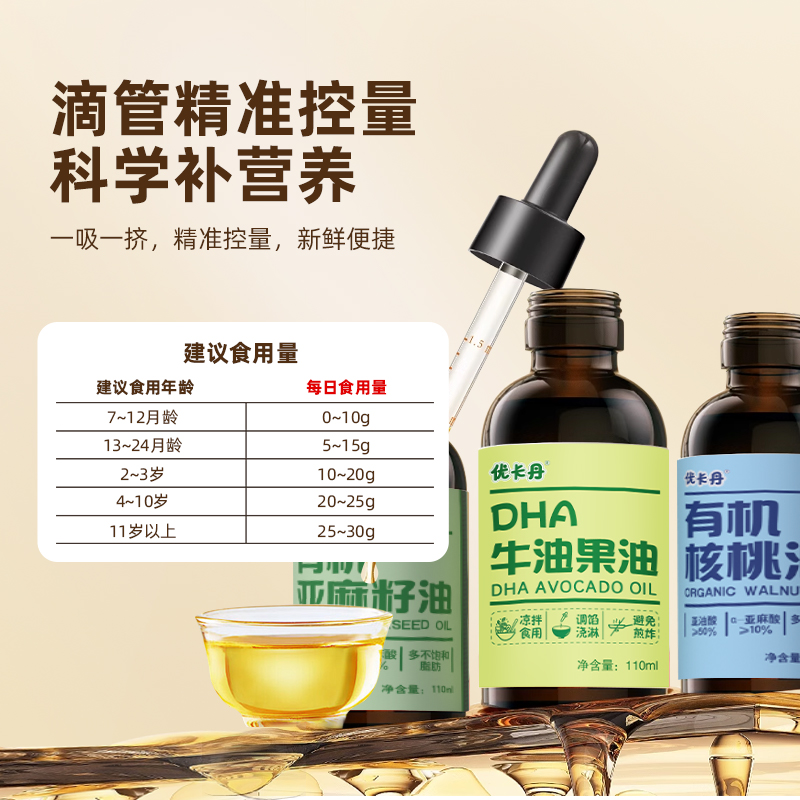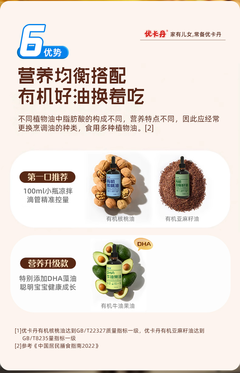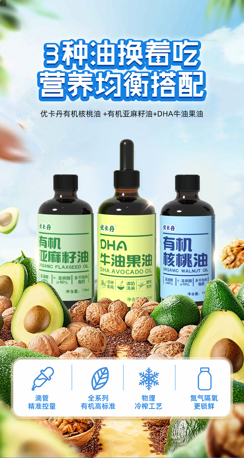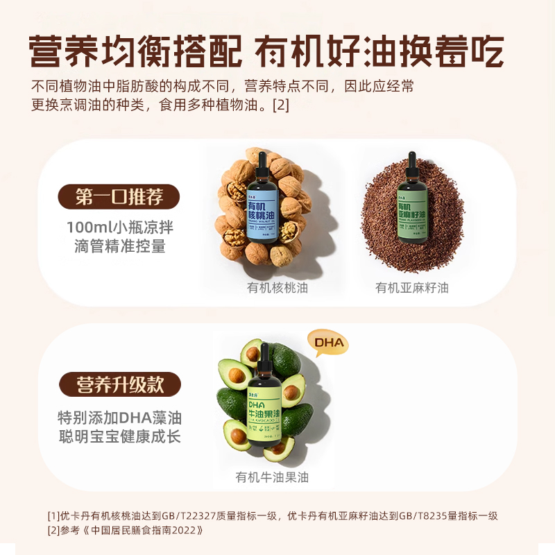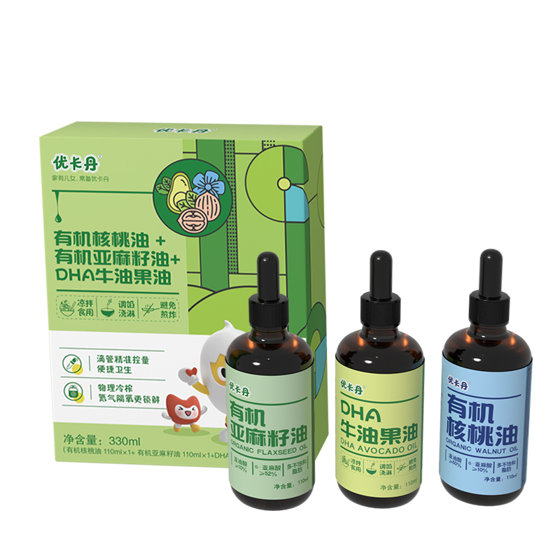 【產(chǎn)品名稱】?jī)?yōu)卡丹有機(jī)核桃油+有機(jī)亞麻籽油+DHA 牛油果油